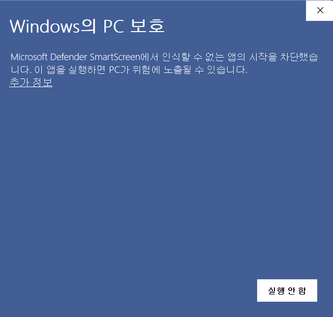 첨부파일에 들어있는 실행파일(.EXE)를 실행하면 다음과 같은 창이 뜨는데 "추가정보"를 눌러주신 후 실행을 눌러주세요