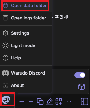 Warudo 에디터 좌측 하단 아이콘을 눌러 'Open data folder'를 클릭하여 StreamingAssets폴더의 경로를 복사합니다